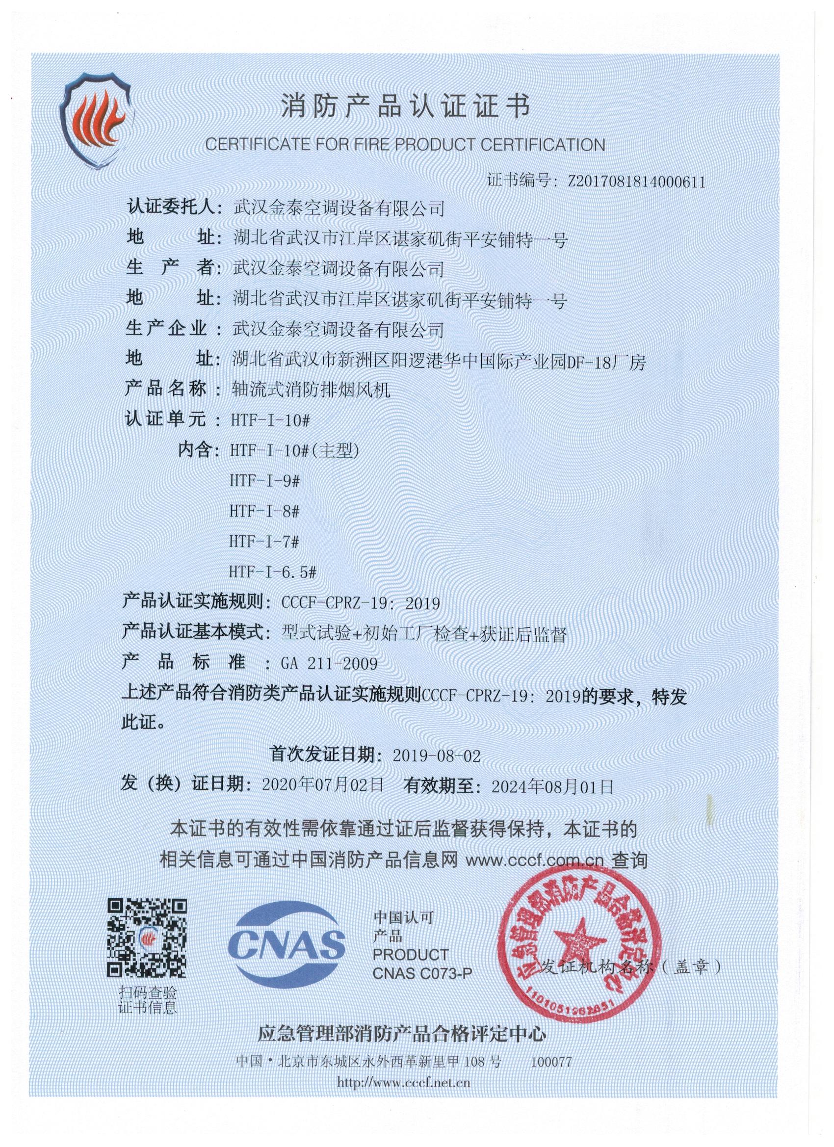 武漢金泰空調(diào)設(shè)備有限公司 是國(guó)內(nèi)長(zhǎng)期專(zhuān)注于民用風(fēng)機(jī)、工業(yè)風(fēng)機(jī)領(lǐng)域的標(biāo)桿企業(yè):專(zhuān)業(yè)生產(chǎn)消防排煙風(fēng)機(jī)系列、排煙防火閥系列、一般通風(fēng)機(jī)系列(軸流式、離心式、屋頂式、壁式、隧道式、射流式)、風(fēng)口、風(fēng)管等消防及通風(fēng)設(shè)備。產(chǎn)品經(jīng)公安部消防產(chǎn)品合格評(píng)定中心評(píng)定符合消防產(chǎn)品CCC標(biāo)準(zhǔn);經(jīng)中國(guó)合格評(píng)定國(guó)家認(rèn)可委員會(huì)認(rèn)證的檢驗(yàn)所檢驗(yàn)合格;經(jīng)國(guó)家防火建材質(zhì)量監(jiān)督檢驗(yàn)中心(四川中心)火燒實(shí)驗(yàn),耐火性能達(dá)標(biāo)。